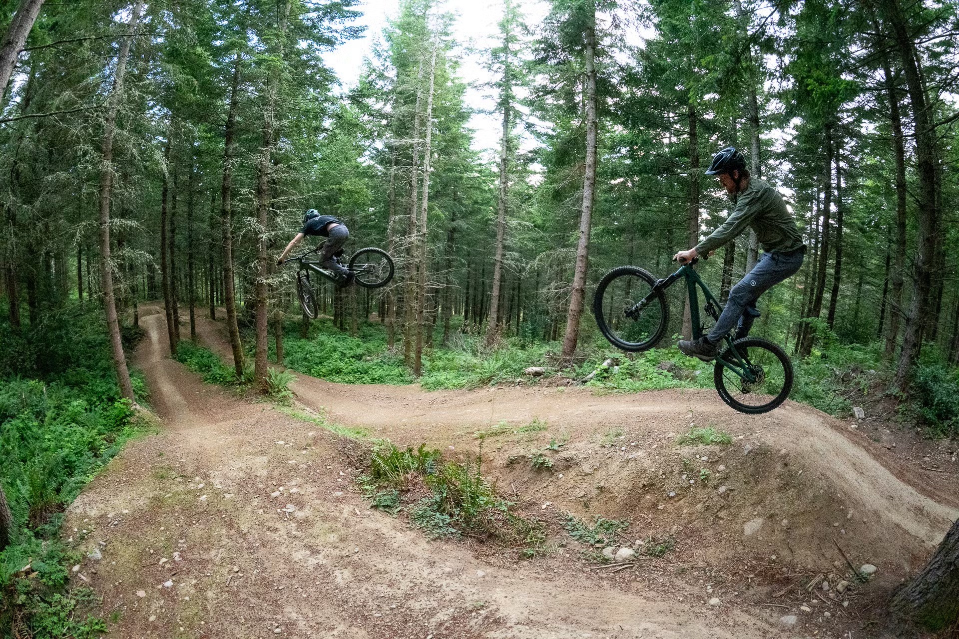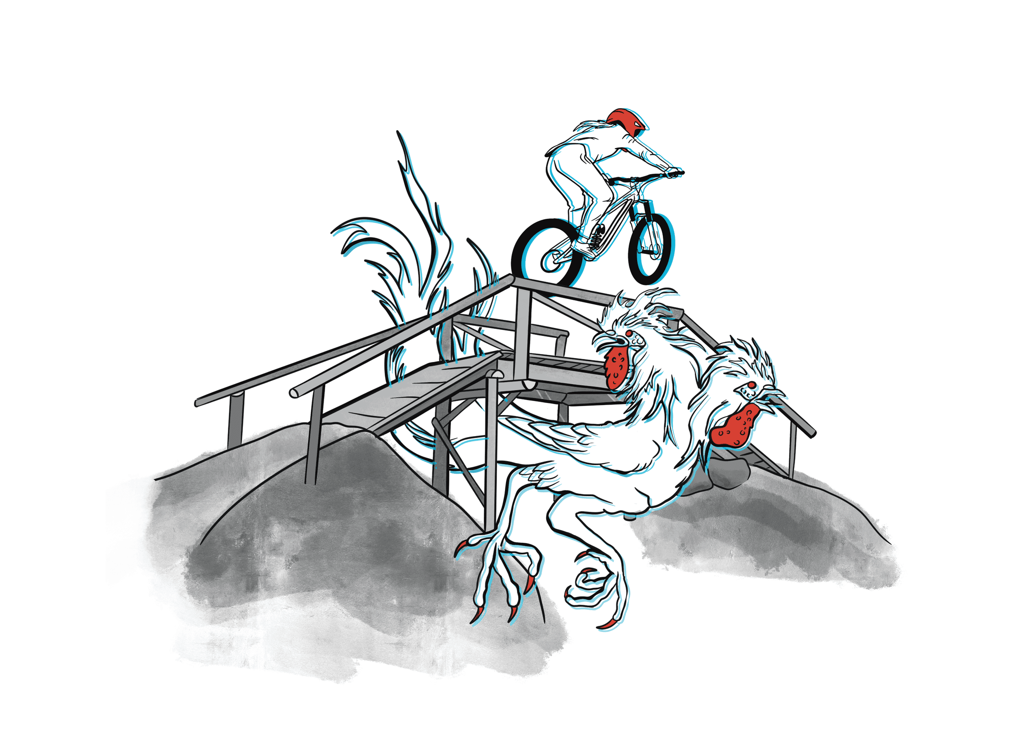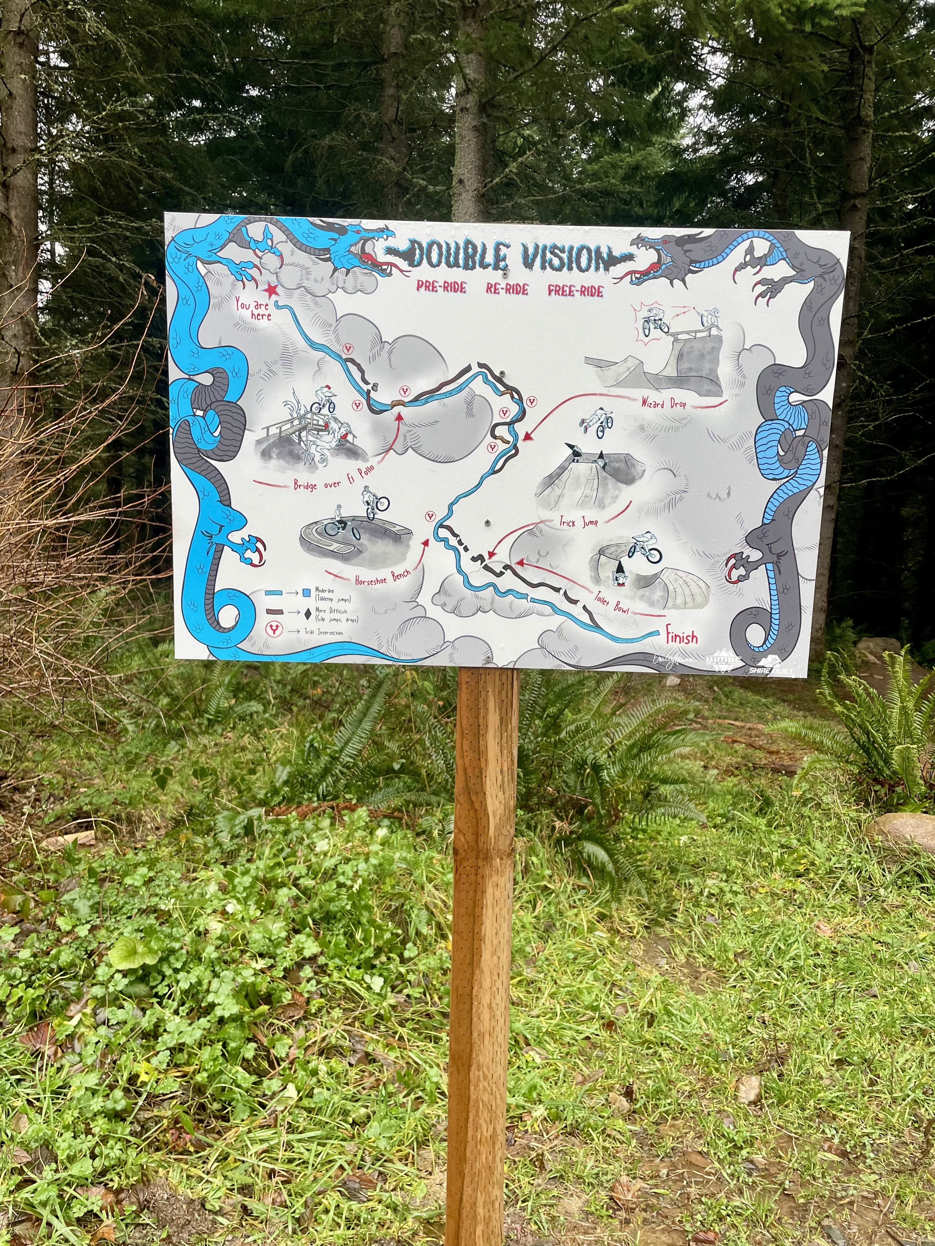 An illustrated trail map for Whatcom Mountain Bike Coalition’s Double Vision jump trail, designed to mirror the disorienting, high-speed rhythm of the ride itself. Layered with intentional double lines, the composition creates a subtle visual echo, mimicking the split-second blur riders feel as they flow from feature to feature.