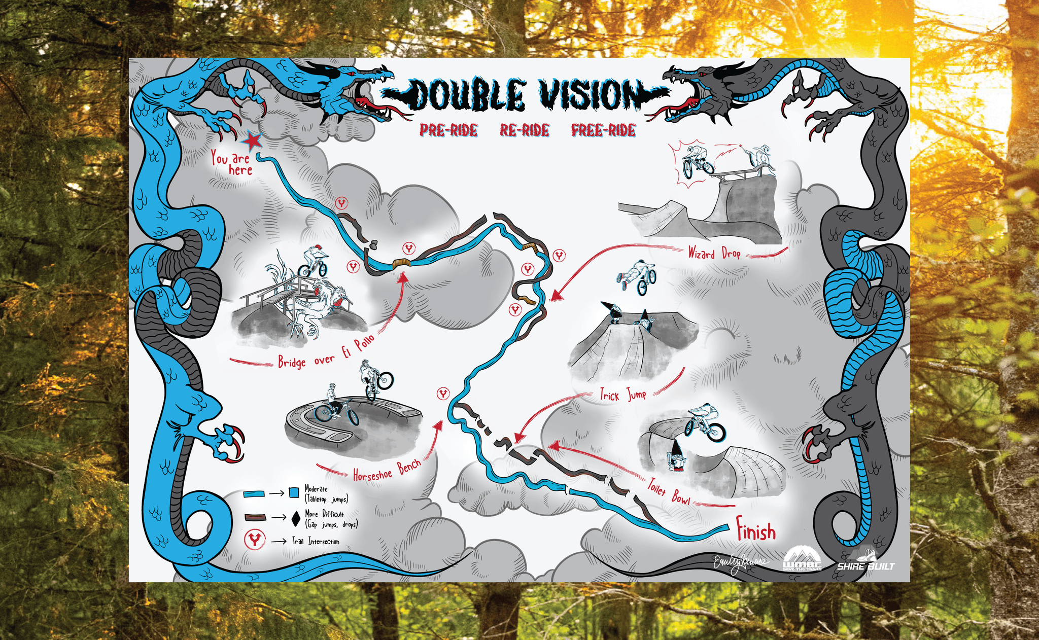 Scattered throughout the map, gnomes and mystical creatures emerge like half-seen trail companions. The result is a map that doesn’t just guide riders, but pulls them into the experience of Double Vision before they even drop in.